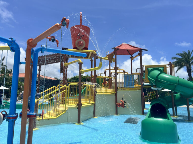 ホテルのプールはちょっとしたスライダーがついてるプールぐらいしかあまりないイメージなのですが、ここは小さなお子様も十分に楽しめる浅いプールや仕掛け満載の水遊びコーナーがあります。