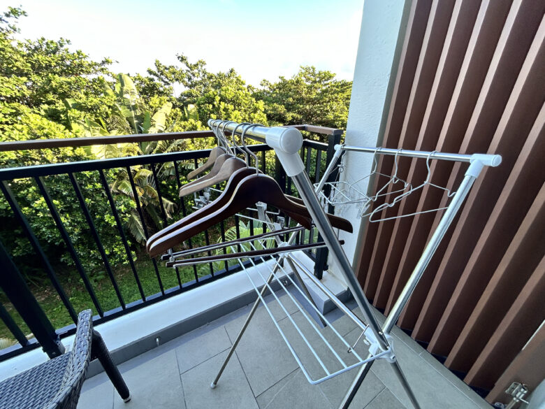 洗濯したものや水着などは、洗濯物干しが用意されていたので部屋に干せます。