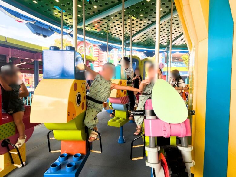 子ども専用の運転体験ができるエリア。体験系アトラクションは1回あたりの定員が少ないため、待ち時間が発生しやすいのが特徴です。 - ブリック・パーティー(メリーゴーラウンド)