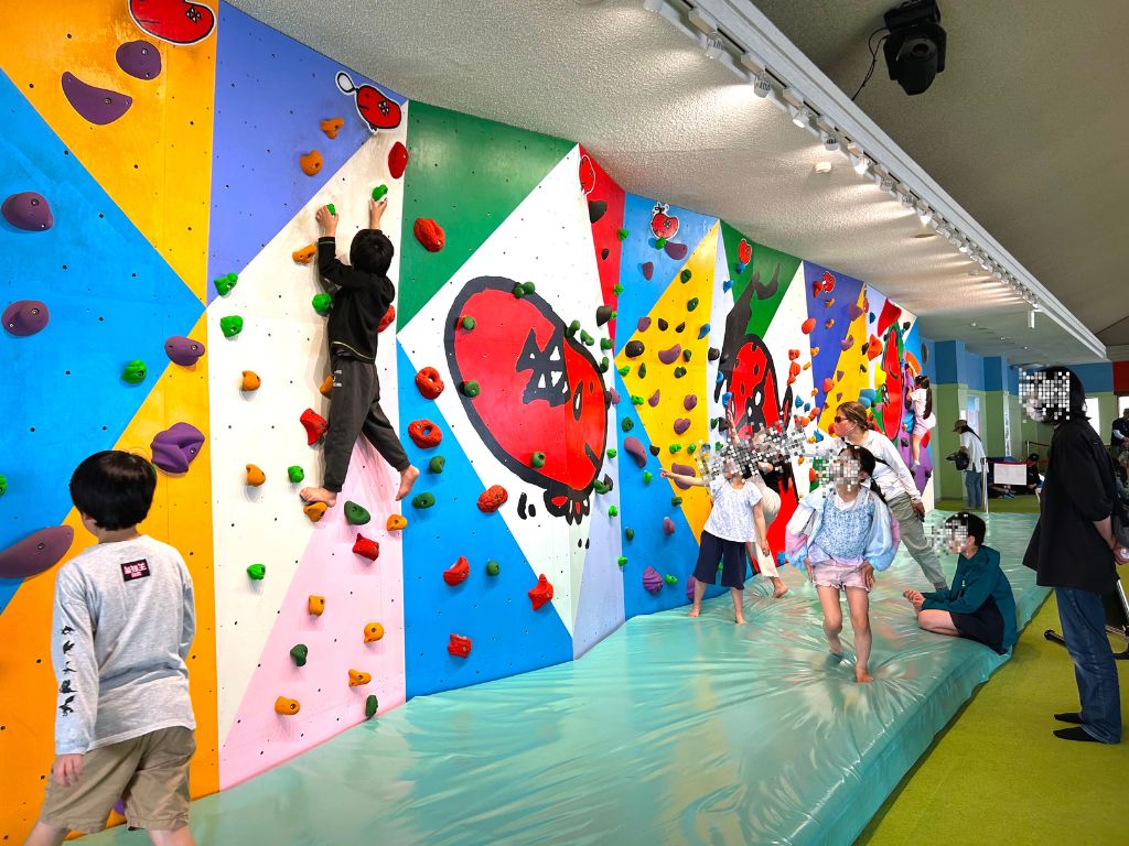 雨の日も安心の室内にはタラピヨボルダリングやジャンボ滑り台、室内アスレチックがありました。