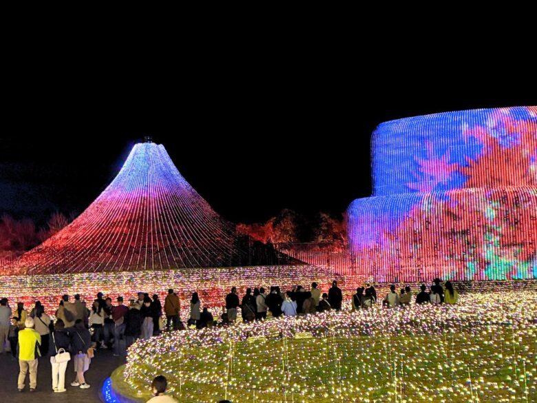 完全に日が落ちると、テーマイルミネーション「ジパング」が魅力的な時間!光のトンネルを何往復もしたがる子どもをうながしながら、メインエリアへ向かうと、富士山を舞台にした光のショーが始まっていました。浮世絵の絵柄がLEDで再現される様子は大人でも見入ってしまうほど迫力があり、必見です。