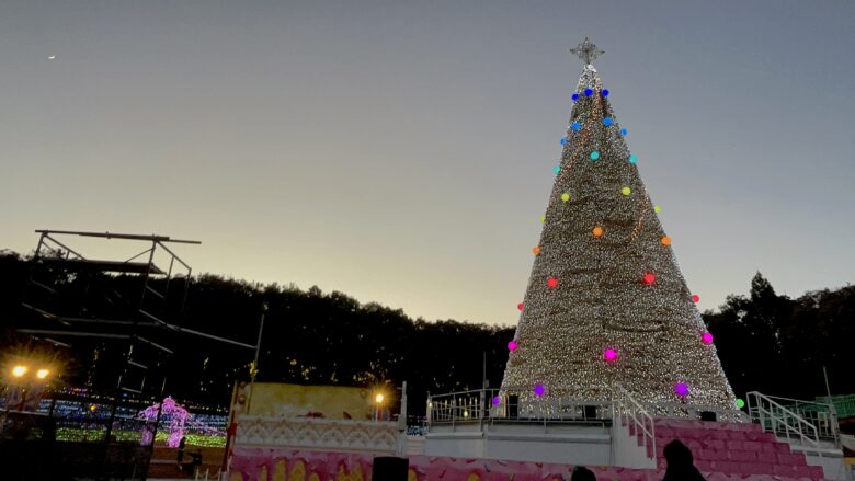 イルミネーションの点灯式が17:15に行われ、ツリーに光が駆け巡るとレオマワールド全体が光の世界に!